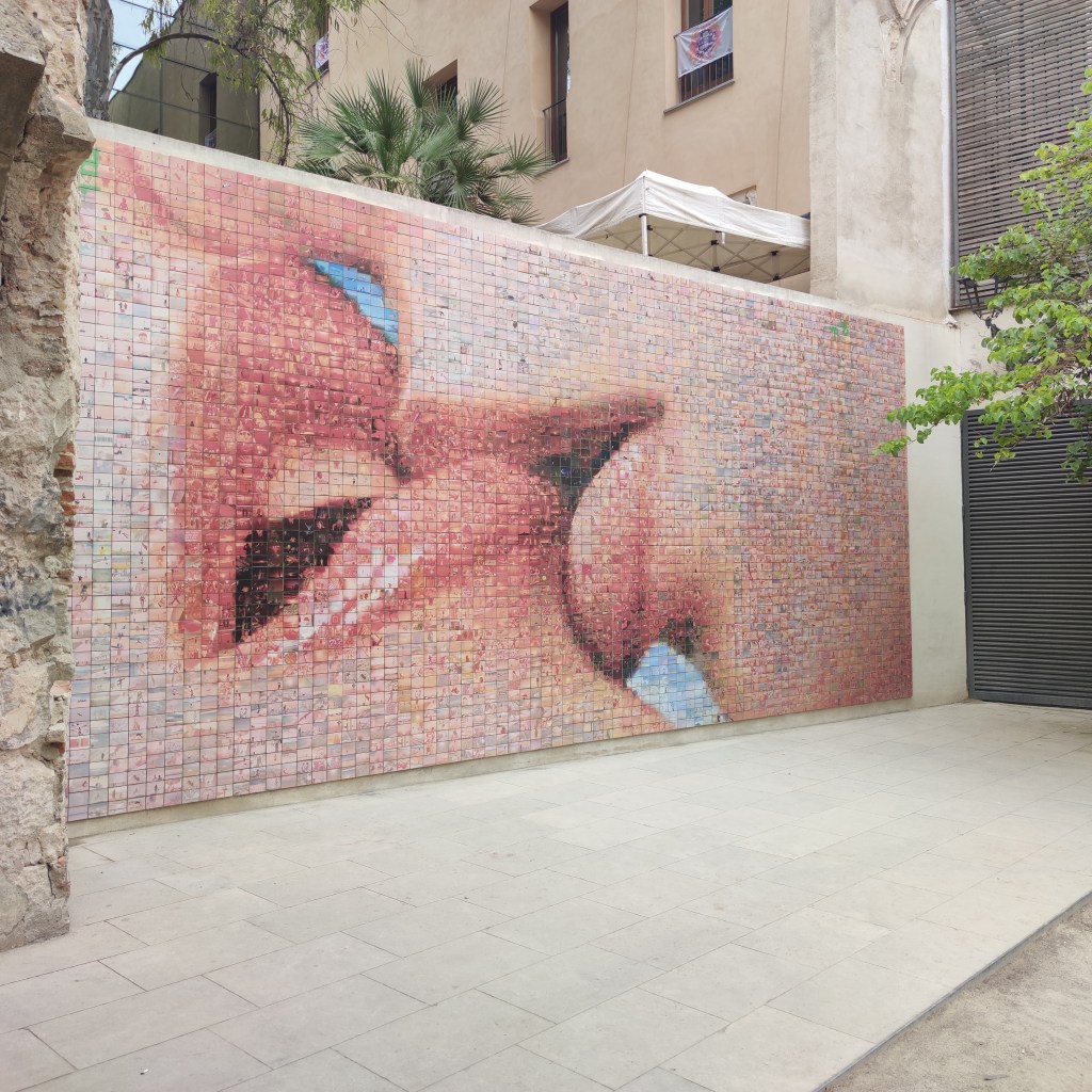 Lo encontraréis en la Plaça d’Isidre Nonell. Se encuentra entre El Portal de l’Àngel y la Catedral. Es un mosaico de 4000 piezas de cerámica de forma cuadrangular creado por Joan Fontcuberta. El conjunto presenta dos personas dándose un beso. El mosaico se creó con fotografías anónimas. El proyecto forma parte de la commemoración del Tricentenario de los hechos de 1714 en Barcelona. «El soroll d’un petó no és tan ensordidor com el d’un canó, però el seu ressò dura molt més. Oliver Wendell Holmes.» (El ruido de un beso no es tan ensordecedor como el de un cañón, pero su eco dura mucho más. Oliver Wendell Holmes.)