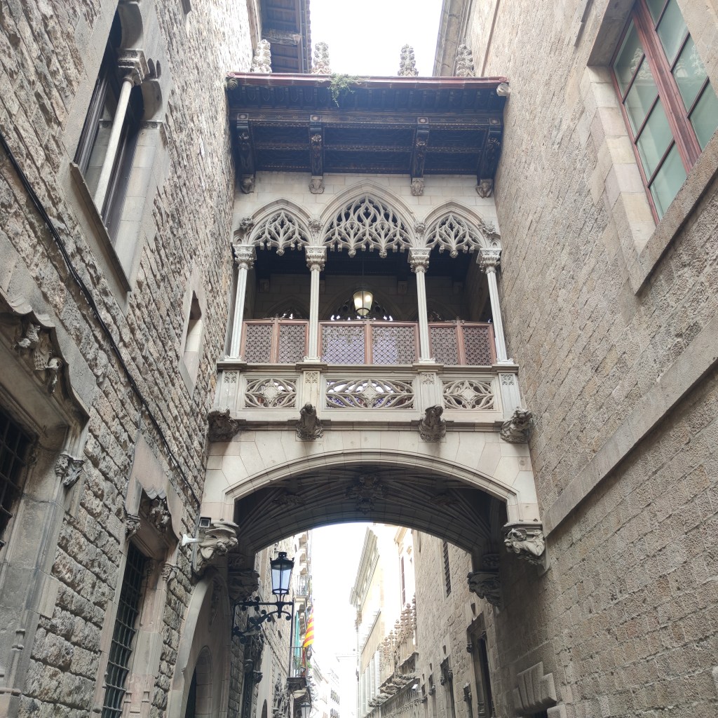 Si no os desviáis para conocer la basílica, seguimos la ruta por el barrio Gòtic para pasar por debajo de uno de los puentes de postal de Barcelona. El puente de la calle del Bisbe. Este une la Generalitat con la casa dels Canonges. Algunos de los presidentes de la Generalitat vivieron en la casa dels Canonges, aunque actualmente no se utiliza como residencia de estos y ha pasado a ser una casa representativa.