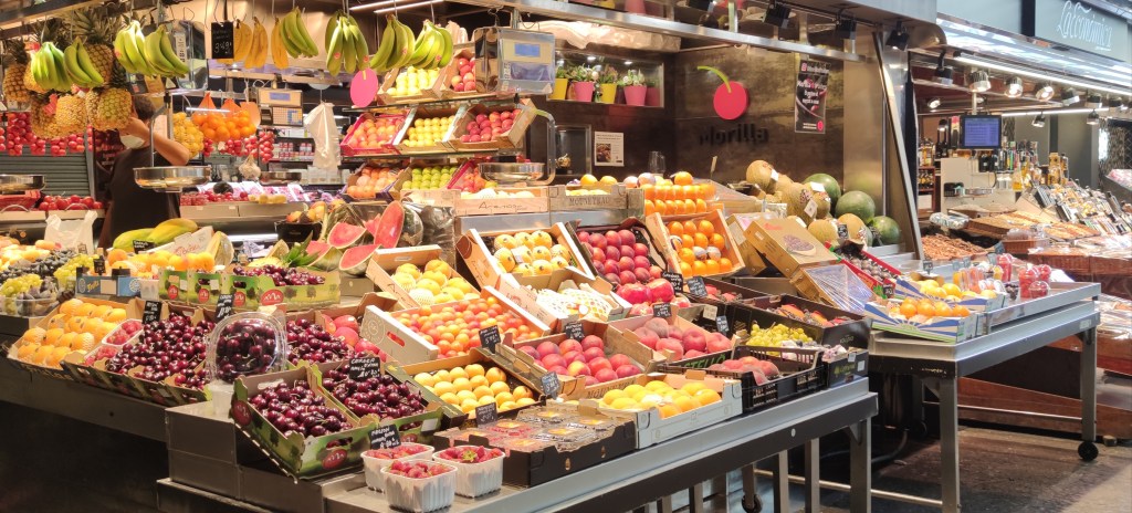 Seguidamente, pasamos por el Mercat de la Boqueria. El mercado se encuentra en la acera de la derecha de Las Ramblas si venís de Plaça Catalunya. Los contrastes de colores de las perfectas pilas de fruta y su increíble aspecto os invitan a entrar y a quedaros alucinados recorriendo todos los pasillos del mercado.